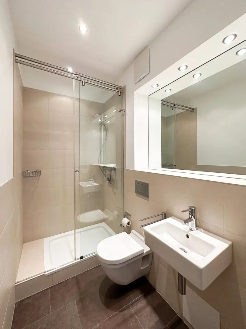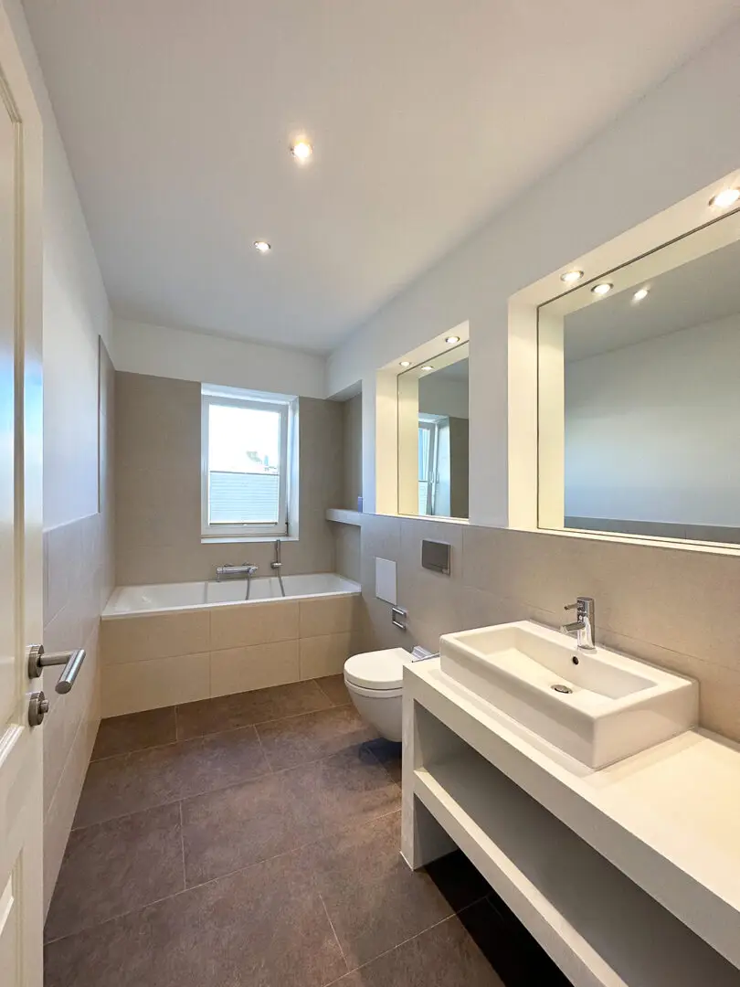 • Zwei stilvoll gestaltete Bäder mit großformatigen grauen Feinsteinzeugfliesen, eingelassenen Spiegeln sowie ausgewählter Beleuchtung durch optimal platzierte Deckenspots