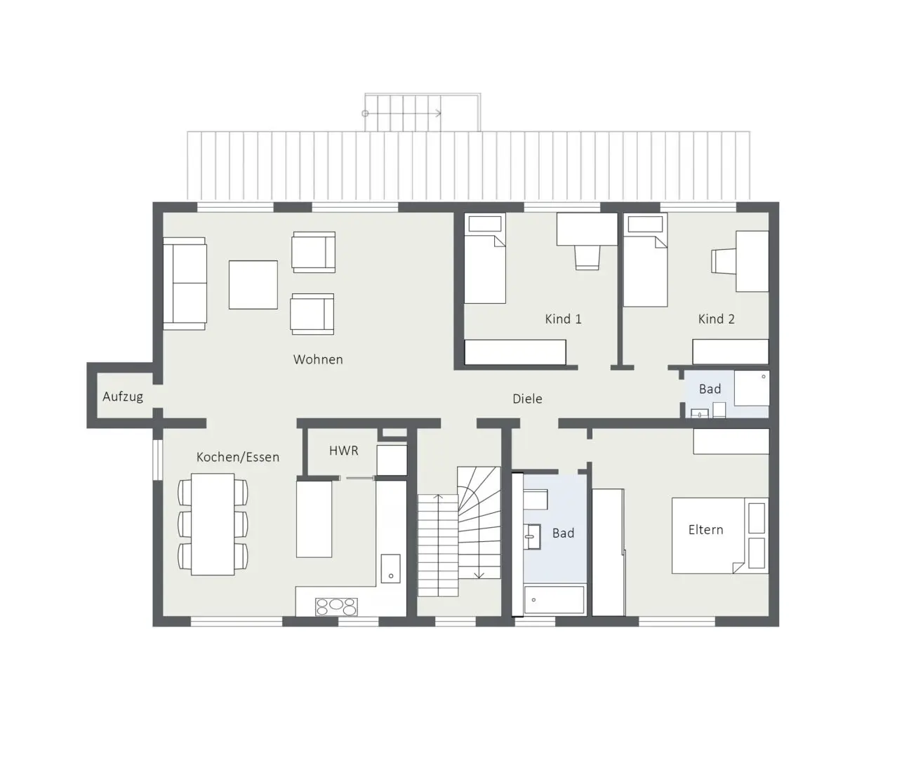 Die Wohnung ist im 1. Obergeschoss und überzeugt durch ihren optimal durchdachten und funktionalen Grundriss.